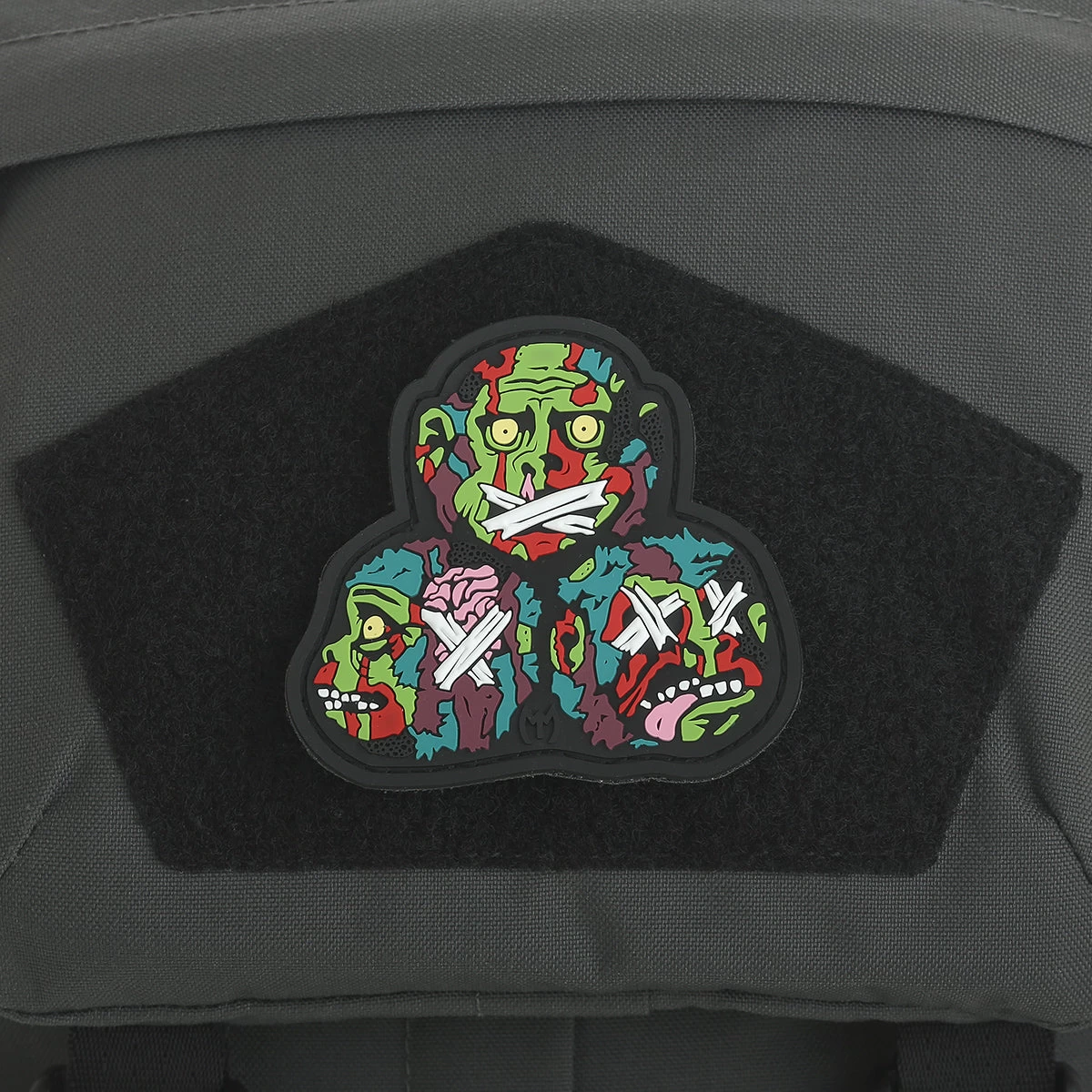The three wise monkeys, with eyes, ears and mouth covered, represent the quote “See no evil, hear no evil, speak no evil.” We gave it a zombie twist for good measure.
