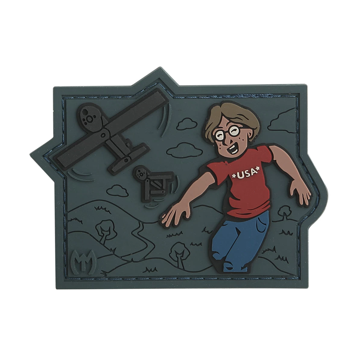 The imagery of a boy flying a paper airplane conveys the ideas of optimism, hope and freedom. In this satirical patch design, the same light-hearted imagery is used to portray America deploying its advanced tools of war such as “suicide drones” to bring optimism, hope and freedom to our allies under attack. Wear this patch to proudly support the proliferation of American democratic ideals around the world.