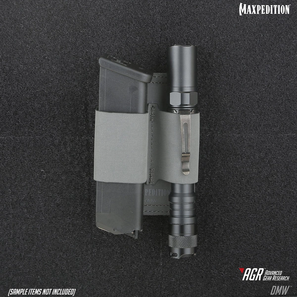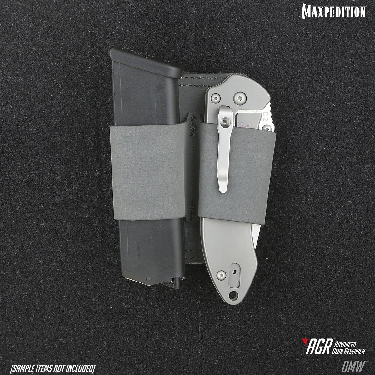 The DMW Dual Mag Wrap has a hook & loop back and can attach to any loop field on Maxpedition bags. It will fit two (2) magazines from a wide range of handgun sizes. It can also be used to hold flashlights, tools, etc.