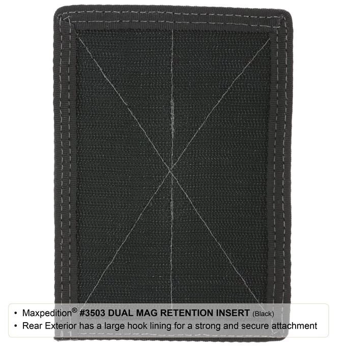The Dual Mag Retention Insert attaches onto the loop field present in the CCW compartment of a variety of Maxpedition packs. Two retention loops of 2” wide elastic each hold up to two single stack .45 mags or a double stacked mag. The loops works just as well with multitools, flashlights, batons, pepper spray, etc.