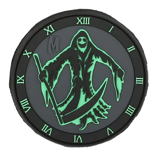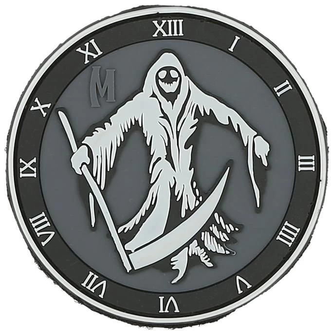 This morale patch features an extraordinary depiction of the infamous Grim Reaper in the center of clock, reminding us not to put off to tomorrow what can be done today.
