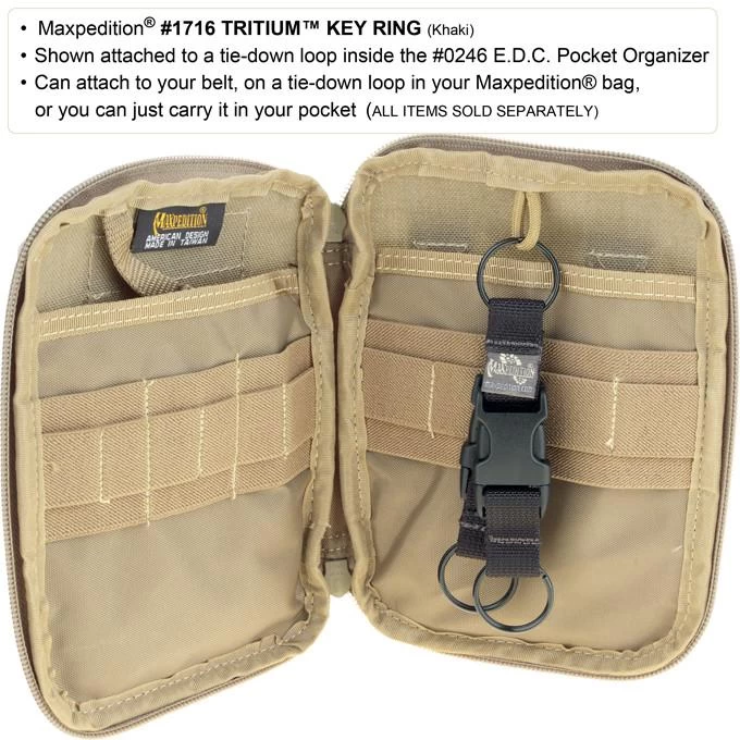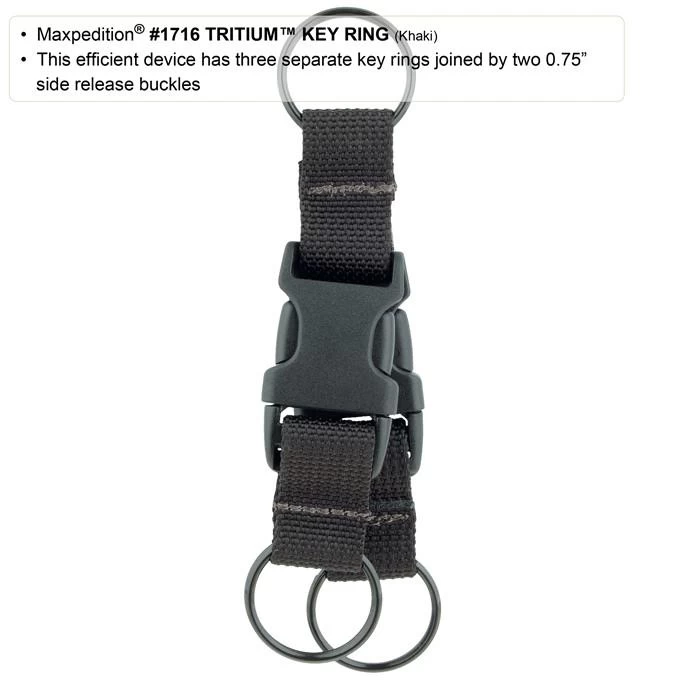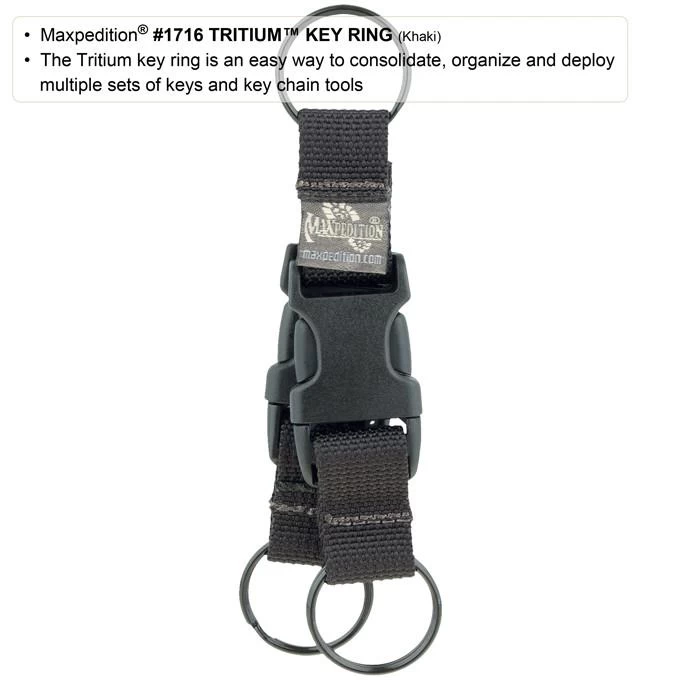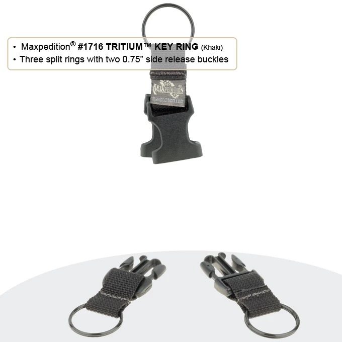 The Tritium Key Ring makes it easy to consolidate, organize and deploy multiple sets of keys and key chain tools. This highly efficient device has 3 separate key rings joined by two 0.75″ side release buckles. It can attach to your belt, on a tie-down loop in your Maxpedition® bag, or you can just carry it in your pocket. Join multiple Tritium Key Rings to keep additional sets of keys or key chain tools together.